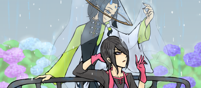 線画修正ではベンチのデザインに閉口して、色塗りだしてから何故かアジサイ描き始めたせいで大分苦しんでましたが、推しカプ描いてることを心の支えにしてなんとか完成させました。
