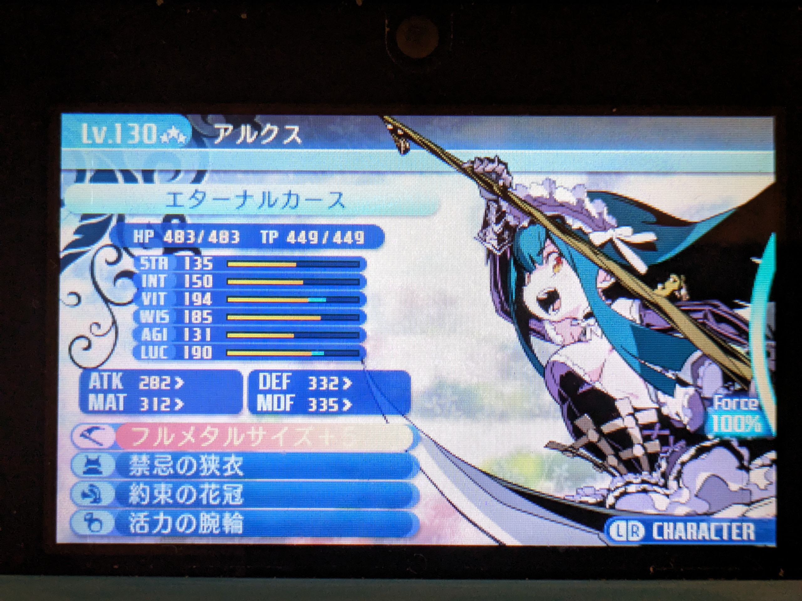 サブクラスはヒーローで、シールドアーツや補助系スキルだけ取ってる。一応気負いとハイランダーのフォースも相性よさげだし。本職の子が全然育ってなかったんだけど、レベル108程度の時にパーティに入れて令嬢さんに挑んだところ、その時点でもそこそこ戦えていたので、頑張って124までレベルを上げてみた。