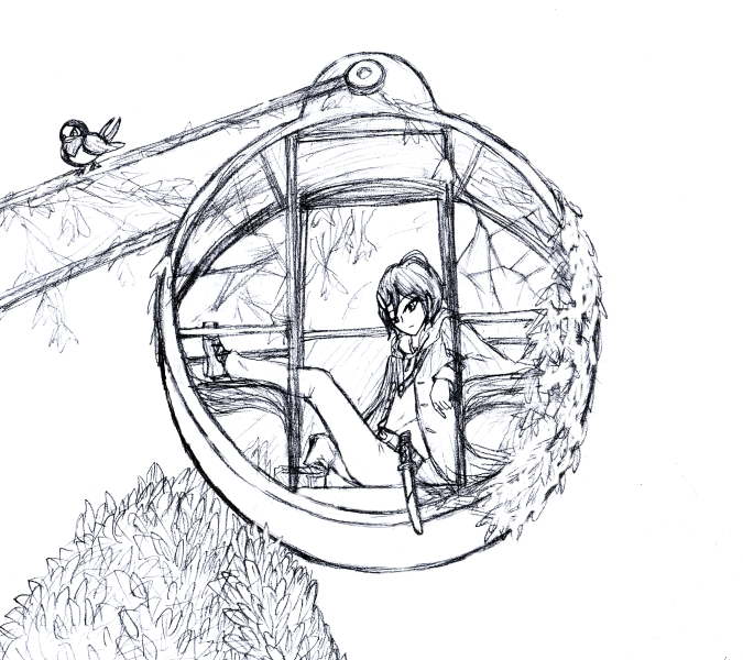最初は普通にチハヤくんに空飛んでもらおうと思ったんですけど、 なんかあまり想像できないし、面白い図でも無かったので()、壊れた観覧車に近くの木伝いによじ登って、そこから周りの景色見てるみたいな、そんな感じになりました。