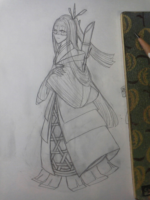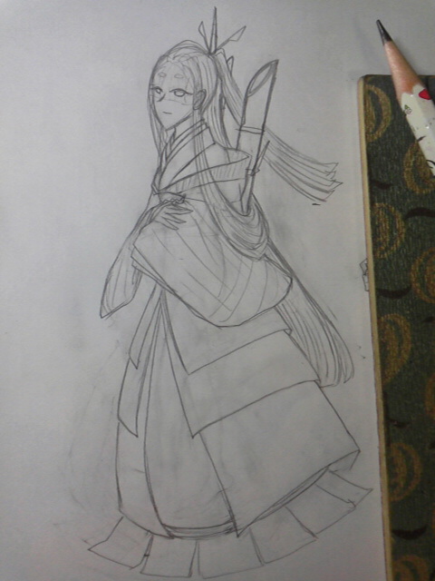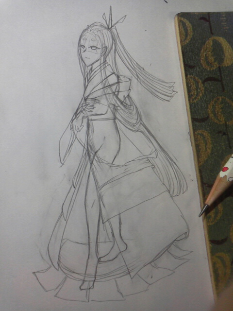 デザイン描いてるクロッキー帳(ノートの時もある)を見つつ、表情とか目とか髪型とか服とかを人体アタリに被せて描いていきます。この時点での線はまだ暫定だけど、この時点で結構細かいとこまで描いちゃうクセがあります。
