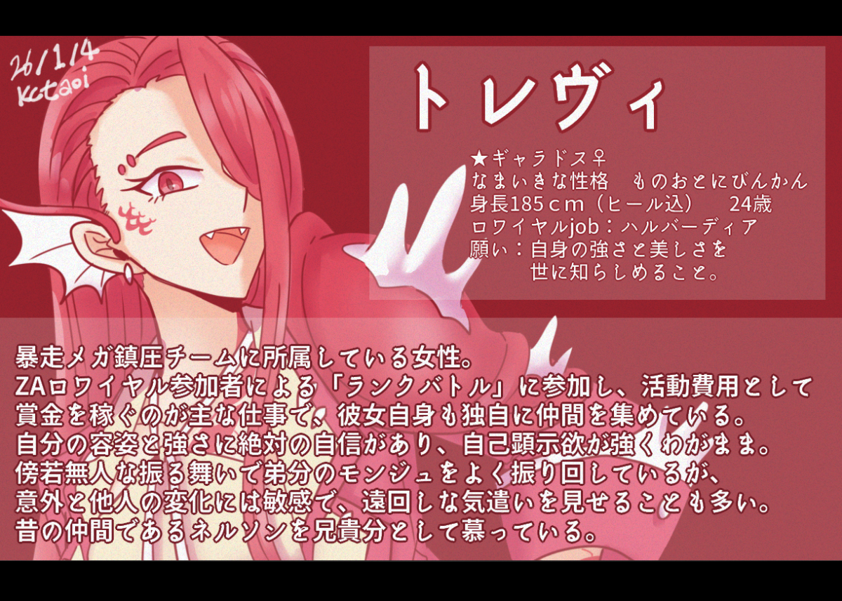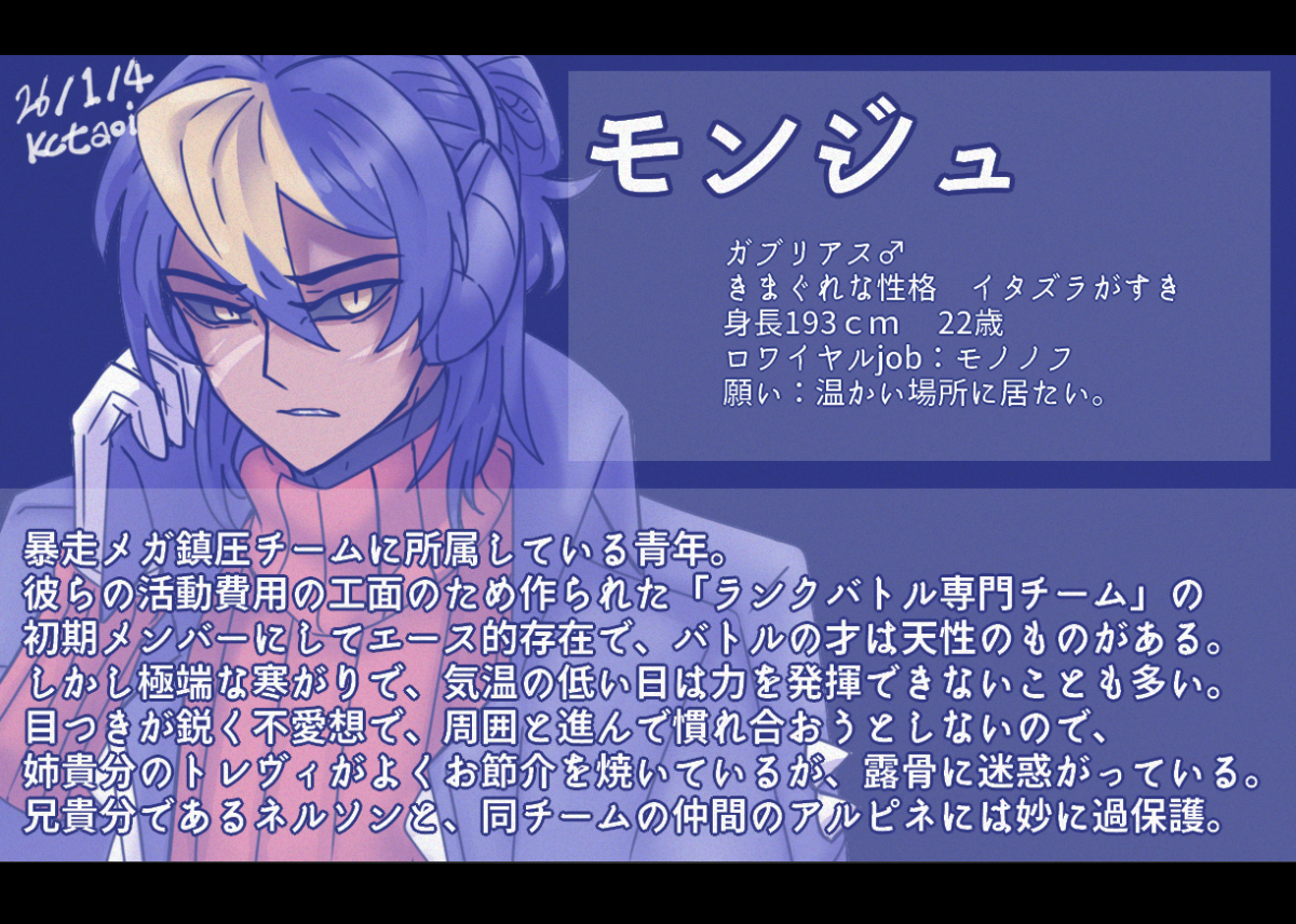 本人の性格+ランクマをしている時の印象わりとそのままに擬しているので、トレヴィは自己主張が激しい(オヤブンギャラ強いんだけど、戦ってるとき画面の占有率が高すぎてなんも見えない時ある)し、モンジュは異常な寒がり(言うまでもないけど画面外から飛んできた冷ビですぐしぬ)、アルピネはサポート要員なので献身的な子がいいな、って感じのキャラになっています。