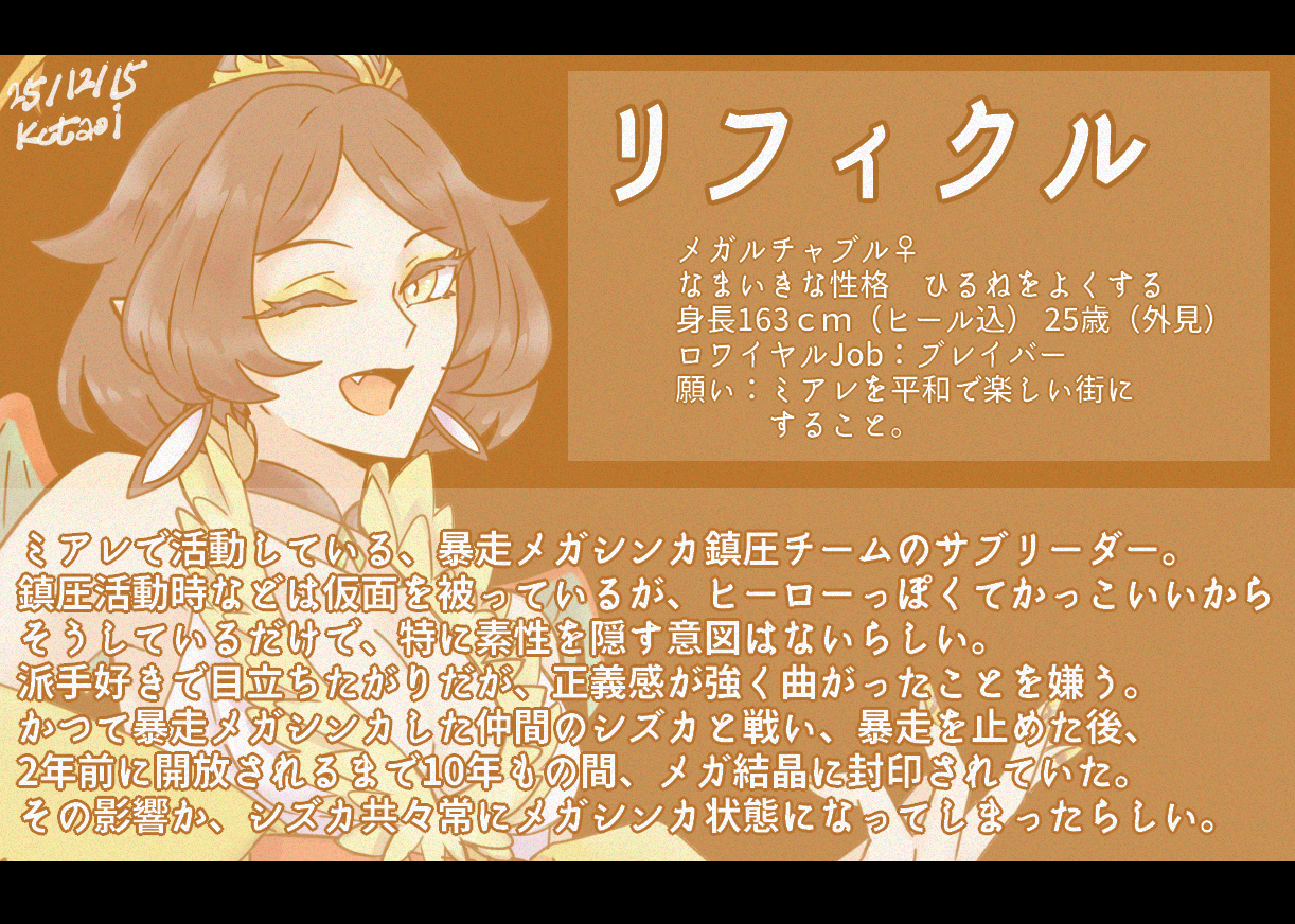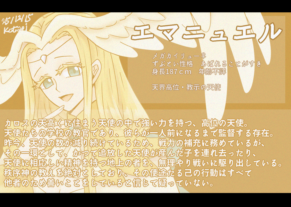 エマニュエルはメガカイリューの説明文を見て、独善でかつての教え子だったシャロン(ニャオニ♀)の子であるミハイルを代わりに天使に育ててあげるために攫うポジの天使とかで出すか…と考えだしたのが最初だったんですけど、ZAの話の大厄災女と化してしまった…。