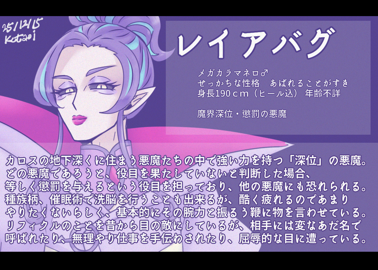 見た目はゲーミングなメガマネロのデザイン見た時に女性よりデザインにしたいと思った後、オネエだったらおもろいなと思ったのでそうなりました(?)立ち絵だと足はあんま見えない構図ですが、高身長+すっごい高いヒールとかはほんのりドラァグクイーンぽいイメージです。