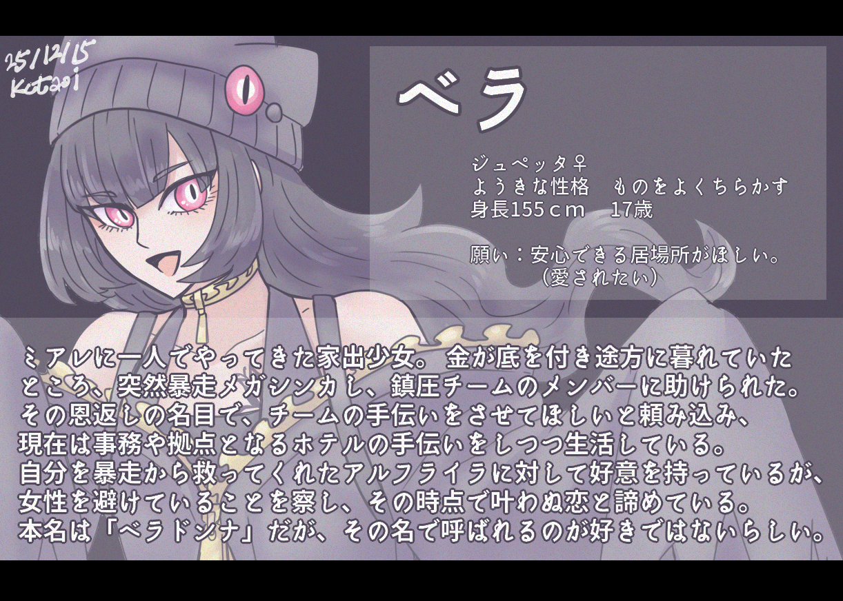 ベラは暴走メガジュペ戦でやっぱりメガジュペのデザインいいな~!になって、ついでに前から構想してたアルフライラ周りの話で出したいポジにピッタリかも…と思い、考えた子だったりします。